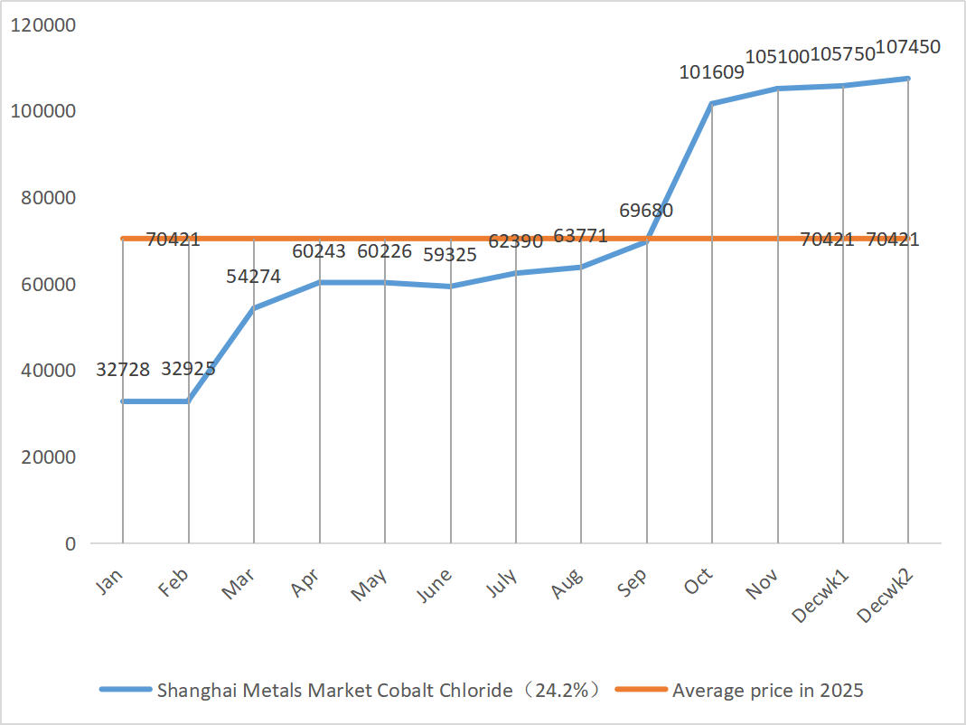 1. Cobalt salts: Raw material costs: The Democratic Republic of the Congo, as the world’s largest producer of cobalt, accounts for 75%-76% of global cobalt production. The country officially implemented an export quota system starting October 16, 2025, with an export cap of only 18,125 tons for the remainder of 2025 and a quota of 96,600 tons per year for 2026-2027, a 56% reduction from actual exports in 2024. The policy has led to a reduction of about 200,000 tons in global cobalt supply, or 40% of annual demand. More seriously, as of early December, the export approval process remains unfinished and actual shipments are at a standstill, with the earliest expected resumption in the first quarter of 2026. Domestic electrolytic cobalt social inventories have dropped to a record low of 2,500-2,800 tons, only enough to meet downstream demand for 8-10 days, the lowest for the same period in nearly five years, and low inventories amplify price fluctuations. Attention should be paid to the implementation of the quota policy in the Democratic Republic of the Congo, the progress of the release of new capacity in Indonesia, and the pace of increasing demand in emerging fields such as humanoid robots.