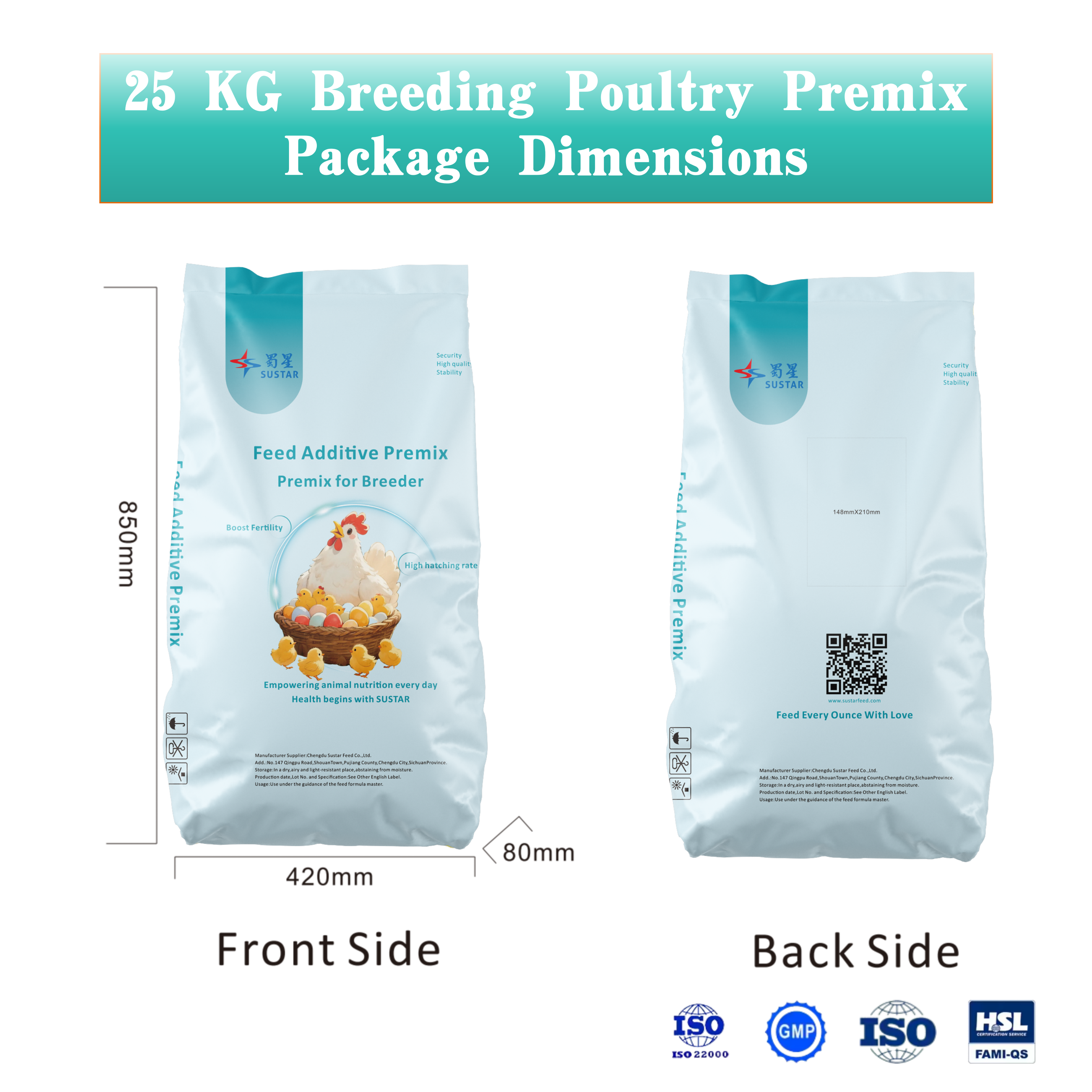 1. The use of moldy or inferior raw materials is strictly prohibited. This product must not be directly fed to animals. 2. Please mix it thoroughly according to the recommended formula before feeding. 3. The number of stacking layers should not exceed ten. 4.Due to the nature of the carrier, slight changes in appearance or odor do not affect the product quality. 5.Use as soon as the package is opened. If not used up, seal the bag tightly. |